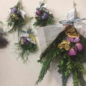 用意したグリーンとドライフラワーをミニスワッグにしました。 I made mini swag with pick green and dry flower of the other day.