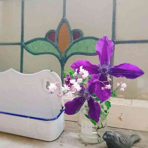 外はまた雨… 部屋は暗い… せめてお花でも飾ろうかな🎶 クレマチスとタリクトラム🌸