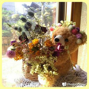 フラワーベアーに 最近はまってしまっているドライフラワーを飾ってみました。和風の家なので 飾る所に思案しています。😅