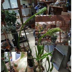 コモチカイソウ オーニソガラム カウダツム なにかの呪文のような名前で舌を噛みそうになりますね😅 植物園からお迎えした名前の通り子供をいっぱい作る植物です。😅 玉ねぎみたいな周りに小さな玉ねぎみたいな子供をつけます。 葉の長さはメータークラス。 よく見ると花芽を出してましたので、あわてて支柱で支えました。😅 花芽も80cm くらい伸びてます。😅 どうやら白い花が咲きそうですよ。🥰 お迎えして初めての花なので楽しみです😃😍