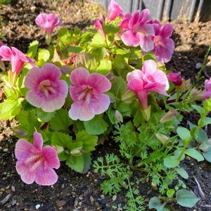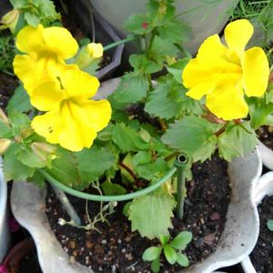 ミムラス 赤ばかり太り、黄色が肩身の狭い状態。 どうしてこんなに成長が違うのだろう。固形肥料とハイポネックス水溶液を黄色の方だけあげてみた…盛り返して欲しい❗️