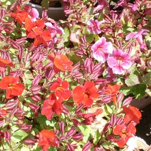 この寄植え背が高いけど何の花かな? 下の方のオレンジはカリブラコアみたいですが…名前よろしくお願いします^_^😄 左はサザンクロスと教えて頂きました🤗