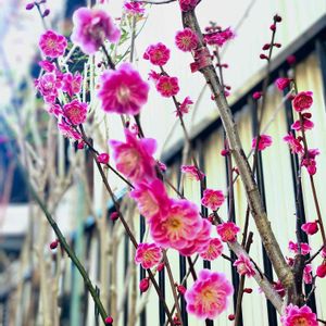 娘とお出かけ🚗 ³₃ 街中に紅梅を見つけました👀 普通の紅梅より紅く八重咲きの鹿児島紅梅です こんな紅い梅初めて見ましたΣ(゚д゚;)