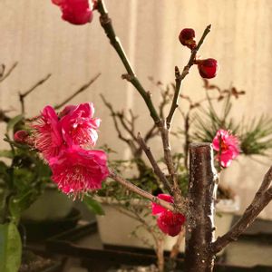 ホームセンターで形が好みの梅の盆栽が半額に。以前は白梅を育ててたけど今回は紅梅。