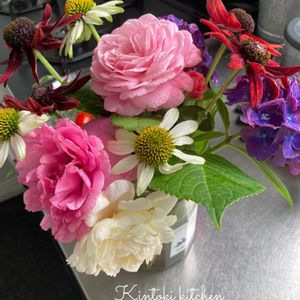 この猛暑でも健気に咲いていたバラやエキナセア早目に✂️してお部屋に、日陰で咲いていた紫陽花も添えて。 暫くキッチンで涼んで下さいね。 年々暑過ぎて薔薇の居場所🌹が限られて来るのかしら。