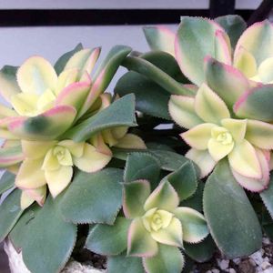 今朝の多肉ちゃん•*¨*•.¸¸♬︎ 小洒落た葉模様になってきた夕映えさん💛💗💚 今日から4月🌸 寒~いスタートになりました😅