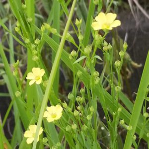 キバナノマツバニンジン アマ科アマ属 葉が茎にピッタリくっついてて、細い茎の先に黄色い花を咲かせる。