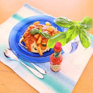 シーフードのトマトソースパスタを作りました🦐🦑🍅🧄🍝 庭のバジルもトッピング💚