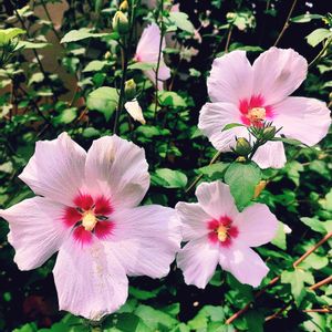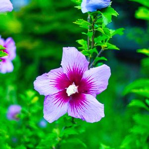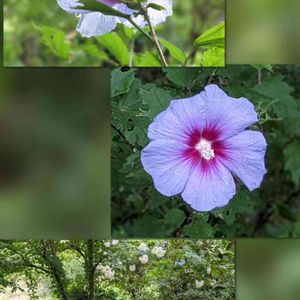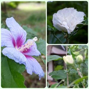 今日のお花💙ムクゲ 庭の斜面へ下りて直ぐの場所に ある木槿2種です 左はピンクが少しブルーがかったブルーバード 右は名前は判らない八重の白い木槿です 左は上の庭の実からの発芽苗を植えたもの 白花は日当たりが悪いせいか咲くのがいつも遅くなります