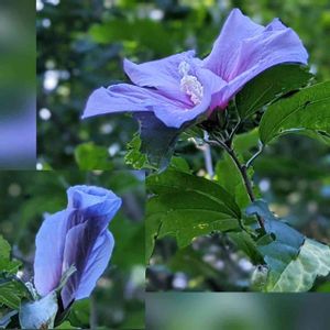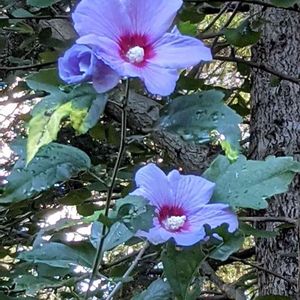 今朝の木槿、ブルーバードです。…雨の雫を纏いながらきれいに咲いていました。