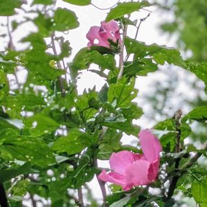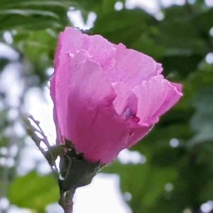 雨の中のピンクの木槿、今日は咲いて良かったかな〜と迷い中…。