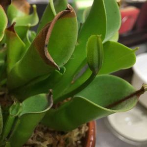 ヘリアンフォラ ヒューベリー×イオナシ、二ヶ月前に購入用土は鹿沼土細粒パーライト日向土、イオナシの交配種はよく育つ、花茎が上がってきたがその先端がおかしなことになっている。普段は一週間に一回灌水しています。