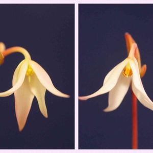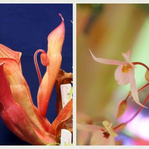 Heliamphora minor Selection 4(左)とH. minor Burgundy Blackの花 開花直後は雄しべが縮こまっていて雌しべが突き出てますが、1週間後には雄しべが伸びて雌しべを囲んでしまいます