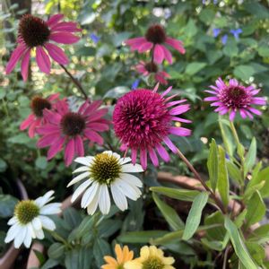 こんにちは♪ 今のところ雲は多いけど日が差しています ⛅️ 今日も園芸店を覗き、前回も欲しかったエキナセアのブルーベリーチーズケーキ(右奥)🩷をお迎えして、帰宅後嬉しくてすぐに鉢へ&記念撮影 可愛らしいエキナセアはたくさんありますがお高めでなかなか買えません😰 ちょっとお値打ちなルージュノワール(左奥)💕も一緒に😉 鉢が寂しかったので、先日投稿の白、黄色も合流しました✨ 皆さんの投稿で素敵な子を知ると欲しくなってしまいますが、少しずつ増やしていきたいです♪