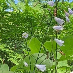 ツリガネニンジン(釣鐘人参) 薄紫色の釣鐘形の小さな花。 青空の下、空き地の法面に咲いています。 あまりの急な斜面で登れません💦 草ばかりで捕まるものがない😭 アップで花冠から突き出ている花柱を取りたいんですが😨 🏷美しく青きドヨウ 🏷土曜は土手の日 🏷土曜は紫の花 🏷青い花で秋祭り2022 に参加させていただきます。 キキョウ科 ツリガネニンジン属 別名: トトキ、ツリガネソウ、チョウチンバナ 開花期: 8〜10月 花冠: 長さ1.5〜2cm 花言葉: 「優しい愛情」「誠実」「詩的な愛」 ※似ている花「ソバナ」花冠から花柱が見えません。