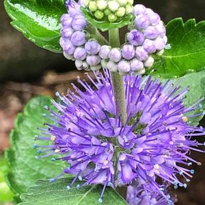 ミツバハマゴウ パープレア クマツヅラ科(シソ科)の半耐寒性落葉低木 花期は晩夏〜秋 樹高は2〜3m(剪定により1m前後にもできる) ミツバハマゴウの銅葉改良種。 葉の表はブラウンで裏が紫がかった葉色の低木です。 秋に気温が下がると紫がはっきりと鮮明になり、藤色の花が咲きます。 オリーブのような樹形で、渋い葉色がおしゃれな雰囲気のカラーリーフツリーです。 西洋ニンジンボクと同じハマゴウ属の仲間で、国内では「銅葉ニンジンボク」「ニンジンボクパープレア」の名で流通しますが、葉や木の姿は西洋ニンジンボクとは全く異なり、生育もゆっくりだそうです。 今年お迎えしました。 若木のうちは寄植えにもできるとあったので、大きめの寄植えの背景に利用しています。 🏷美しき青きドヨウ 🏷青い花マニア 🏷ブルーのときめき❣️ 🏷青い秋の花2022