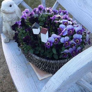 ガーデニングの参考になりそうなお宅の白いベンチに飾ってあるビオラの籠🧺 夫に作ってもらいたいなと思わせる趣のあるベンチ! 来年の干支であるウサギも可愛い🐇💕
