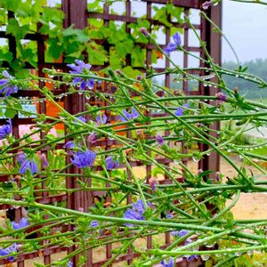 背の高いチコリが 横なぐりの風にやられてから数日(ー_ー ) 先週の雨の朝、 雨粒に覆われて真横に咲いていた💙 地面に叩きつけられるのが可哀想だから 高さ1m以上の脚付きプランターに植えてあげてる ヾ(  ̄▽)ゞオホホホ