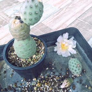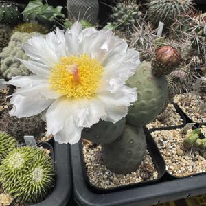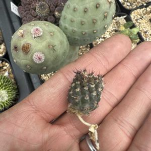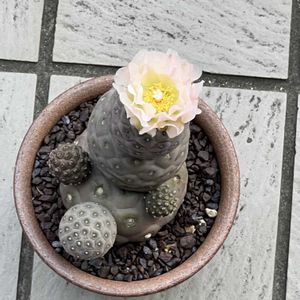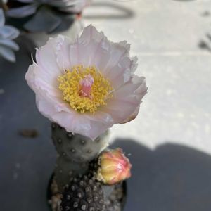 テフロカクタス・ゲオメトリクス 2つの花芽のうち1つが開花しました☺️ 可愛い🩷 子株も順調に育っています😊