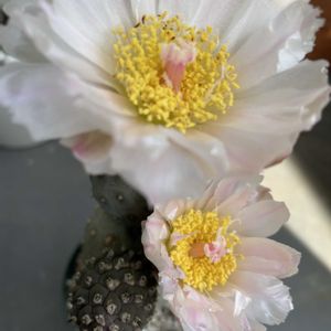 テフロカクタス・ゲオメトリクス 6/24撮影 前日の花がまだ咲いている中で下の2つ目が開花しました☺️ 病院の検査が続き投稿が遅れました😰 終わって結果良しで遅れましたが投稿しました☺️ 3つ目のお団子はやはり子株の様です♬ 2年ぶりに1つ増えました☺️