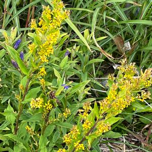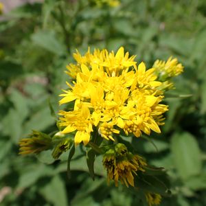 ミヤマアキノキリンソウ [深山秋の麒麟草] (コガネ菊ギク、アワダチソウ) キク科アキノキリンソウ属 在来種で草丈15~30センチ花は1.2~1.5センチ。 アキノキリンソウの花が比較的まばらにつくのに対し、本種は頂部に固まってつきます。分布は北海道と本州中部北部となっていますが、徳島県の剣山には分布外の植物が多数自生しています