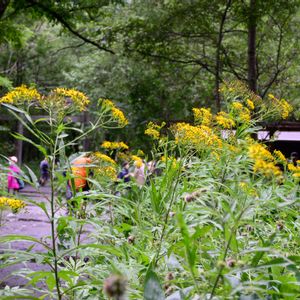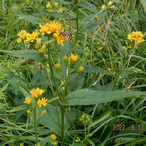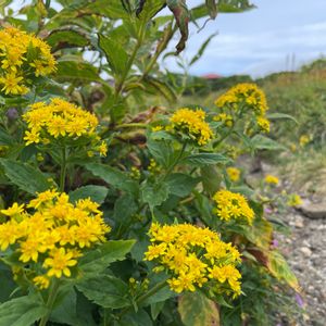 樹々の間から差し込む光を浴びて咲く 深山秋麒麟草(ミヤマアキノキリンソウ) *キク科アキノキリンソウ族多年草 *別名:コガネギク *花期:7〜9月(函館山) *本州中部以北・北海道に分布。 *アキノキリンソウの花序は縦に長く伸びてまばらに付く傾向があるが、ミヤマアキノキリンソウは茎の頂端にまとまって咲き、総苞片が3列。4列のものがアキノキリンソウとされている。