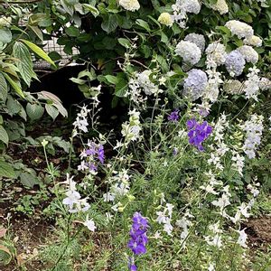 6月、陰暦では水無月とはいえ、梅雨の時季。私の散歩道の道際等の草花達は、益々緑を濃くして、その彩を映えるものにしているようだ--- 5月からの、草花達の生き生きとした姿、姿---その23。 白と紫の、白紫の、2つの草花。 ---陽の少ない時季の、何時ものオープンガーデン。 この時期の風景、まだそんなに華やかな彩色は付けてはいない。 ここの湿気を含んだ大気の中に、白と紫の、白紫の2つ草花、チドリソウとアジサイが、色合いシックに、その同調表現を、お互い静かにそこにしていた。 チドリソウは既に4月から、アジサイはこの時季、方々で観てきたが、ここではまた違った趣きを得たような気がしたのである。 ・ラークスパー<別名 ヒエンソウ<飛燕草>、チドリソウ<千鳥草>>(キンポウゲ科 ヒエンソウ属) (備忘; ラークスパーの属性等 5/2 ‘21) ・アジサイ<紫陽花、八仙花>(アジサイ科 アジサイ属) (備忘; アジサイの属性等 5/30 ‘21)