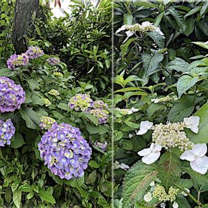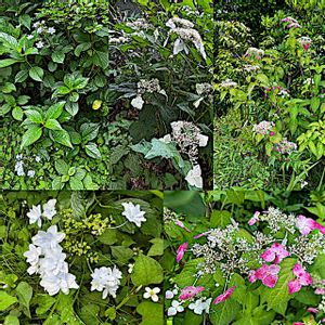 7月は文月(ふみづき)、穂含月(ほふみずき)つまり穂が実る月とされる。 今年は昨年より長く続きそうな梅雨の様子も、その後はまた暑い熱い時期がやって来るのでしょう。 私の散歩道の道際等の草花達は、次第に多彩な色彩を作り初めている--- 6月からの、熱い夏に向う準備に忙しい草花達---その2。 /所用帰りの歩道際、 並びて観るは初々しい淡い白と紫の花/ 6月上旬の所用帰りの歩道際。 その歩道では、一般的な商店街からは少し歩を進めていくと、比較的に洒落た住宅が幾つかが連なって、そこには常緑木や落葉低木などが植栽されていて、その脇の歩道際では、四季の折ふしの赴きが感じ見ることができるのである。 そこは、低い石塀に仕切られていてそれに沿っては、市外地に見られる様な自然に任せていような風景が見られるのである。 足が、前に進む。 そこには、この時季を代表するかのようにみられる落葉低木が相並んでいて、その淡い白や紫の花を、初々しく静かに咲かせていた。 アジサイ(紫陽花) →ガクアジサイ(額紫陽花/アジサイ<紫陽花>) →アジサイ(紫陽花/ホンアジサイ<本紫陽花>) <’アジサイの一般的な特徴とガクアジサイの特徴とその謂れ‘について、下記の「アジサイ」より抜粋、次に: (アジサイの一般的な特徴は) 花序は大型で、5月から7月に紫(赤紫から青紫)の花を咲かせる。 一般に花といわれている部分は装飾花で、大部分が中性花*からなり、萼が大きく花弁状で目立つ。 中央にある両性花*は極小で目立たず、退化した雄蕊10本と雌蕊3 - 4本がある。 (ガクアジサイの特徴とその謂れは) 花序は多数の両性花*を中心として、装飾花が周りを縁取る。 名称の「ガク」はこのさまを額縁になぞらえたものである。 花序は直径12–18 cm、装飾花は直径3–6 cmで色は白色・青色・淡青緑色・または淡赤紫色、両性花*は濃紫色である。葉は厚く、大きいのが由来となっている。葉の表面は濃緑色で光沢がある。 *両性花/中性花: 雌しべと雄しべの有無によって分けると、両方があると両性花(雌雄同花)、片方しかない花は単性花であり、雌花と雄花の別があり、雌雄異花である。 両方がないか、あっても生殖の機能がない花は中性花または無性花と言う。> ・アジサイ<紫陽花>(アジサイ科 アジサイ属) ( 備忘:アジサイの属性について 5/30or5/31 ‘21)