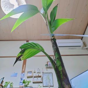 室内のココヤシたち 1枚目のココヤシはいつの間にかカイガラムシが大量発生していて葉が所々傷んでますが、今のところ冬枯れはしてません。 2枚目のドワーフココヤシは状態がかなり良好で、緩やかですが成長続けています。
