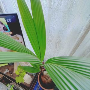 ちなみに3年前に発芽した初代ココヤシの現在。日に当てると主脈が黄色く色付きました。 前に載せた新芽はすっかり開いてかなりデカい葉に。(2枚目) このまま本葉が出たら凄い大きさになりそうです。