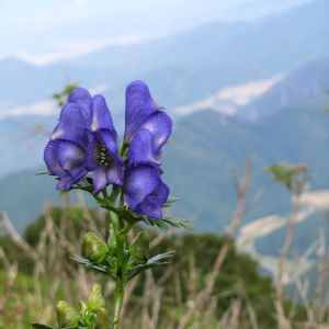 イブキトリカブト(伊吹鳥兜) キンポウゲ科トリカブト属の多年草 深い紫色の花は、どこに咲いていても、目立っていました。 花弁に見える部分は、萼片で、 上部の兜と側部、下部を作って、 花弁は、兜の中に隠されているそうです。 雄しべだけが、チラッと見えます。 花は、上から咲くようで、 茎頂部の花は終わり、種子がパンパンに詰まったサヤマメのような実がついていました。 日当たりのいい草原では、草丈が低く、真っ直ぐ立っている株が多かったですが、半日陰に生えているものは、大きくて、花つきもよかったように思います。 猛毒で知られていますが、 シカ🦌に食べられるそうです😓