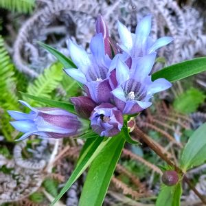 リンドウ(竜胆) リンドウ科リンドウ属の多年草 本州、四国、九州に分布 ①②③ 2025.10.30 海上の森にて チョロチョロと、水が流れる谷川近くに、ポツンとひと株だけ、花の重みに耐えながら咲いていました。 ④⑤ 2025.10.13 伊吹山にて お仲間が沢山、傍に生えていて、 賑やかでした。