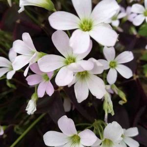 オキザリスの白い花に ほんのりパープルが差しています 葉っぱも紫だったからムラサキノマイかな 別名:オキザリス・トリアングラリス 花言葉:「決してあなたを捨てません」「輝く心」