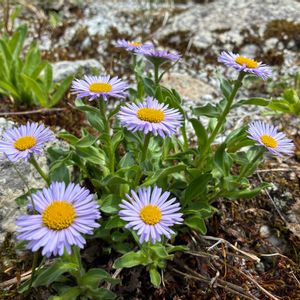 八方尾根第二ケルン周辺にはまだ雪渓がありました。 そのそばに可愛いらしいミヤマアズマギクがいっぱい咲いていました🌸💕🎶 ミヤマアズマギク キク科 ムカシヨモギ属
