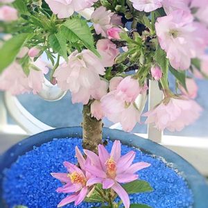 睡蓮木同時に3輪開花😊 桜盆栽の化粧砂、家にあった青いカラーサンドってどうよ☹️と思いつつ、無いよりはまし?あり?と思いつつ敷いてしまっていたけど なんちゃって睡蓮的になったけど桜の景色としては、、、😅