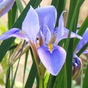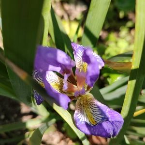 カンザキアヤメ(寒咲きアヤメ)が咲いていました。 別名カンアヤメ(寒菖蒲)、ウインターアイリスとも✨ アヤメ科の多年草で、外側の3枚の花弁と内側で直立した3枚の花弁があります💜 アヤメですから、基部の中央に黄色い🟨斑と網目状の模様があります🎶😃