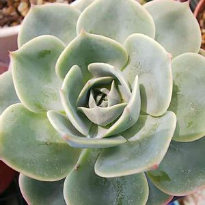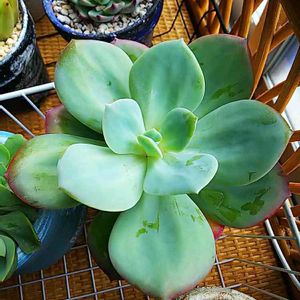 こんばんは🌙.*·̩͙.。★*゚ 天気が悪くて室内に居る白鳳♡♡エケベリア 大きいね!!私の持っている多肉さんで1位か2位位のサイズ(๑´ω`๑)♡キュン 外側のピンクの淵が可愛い!! お粉は私が植え替えで触って取れてしまったわ😭