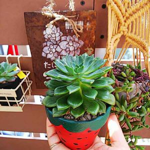 いちごの日🍓✩°。⋆♡*° いちごのリメ鉢で参加しますm(*_ _)m 娘がいちごの鉢を作って似合う多肉さんを選ぶって言ってエメラルドリップをお迎えしたの!!もうすぐ1年かぁ... 葉の枚数増えたな♡♡ 秋には✂かなぁ…🤔💭