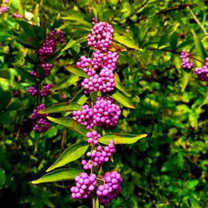 天覧山にて 【コムラサキ】 コムラサキは、同じような紫色の実をつけるムラサキシキブ(紫式部)とは別種の植物ですが、ムラサキシキブという名前で流通していることが多く、園芸的にはムラサキシキブと同種として扱われているようです。