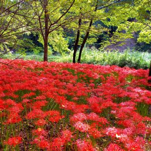塩船観音寺より 【彼岸花】 秋の彼岸の頃、土手や道ばた、田んぼの畦道や墳墓の周辺に葉の無い鮮紅色の花が各地で見られるようになります。ヒガンバナの名前の由来はまさしく「彼岸に咲く花」です。別名の曼珠沙華(まんじゅさげ)は「赤花」を表す梵語(ぼんご、サンスクリット語)です。ヒガンバナは多年生で、草丈は20~40 cmになり、地下に鱗茎(りんけい)を有します。初秋の頃、花茎をまっすぐ伸ばし、その先に長い花柄を持った鮮紅色の花が数個輪生状に開きます。葉は濃緑色で中央に線が入った線形で、花が終わってから伸ばすため、葉と花を同時に見ることができないユニークな植物の一つです