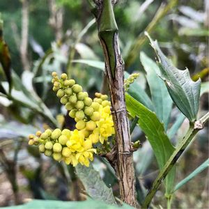 これ。 庭に生えているの。 葉や茎がちょっと傷んでいるのですが、この黄色いのが可愛くてパチリ📷 名前を教えていただきました。 「ホソバヒイラギナンテン」だそうです❣️