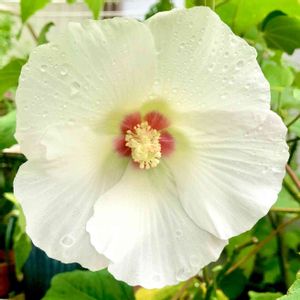 6時間後の芙蓉(フヨウ) 雨が降ったり止んだりで、色づきが悪いです😰 しかも、花びらが傷んでいます😭 でも❣️ 花びらの端の方が少しピンクがかってきたの、分かりますでしょうか? 実家には、ずっとは居られないので、これが限界でした😅 また、晴れの日、夕方くらいに咲いているフヨウを見られますように。 おそらく、ピンク色です🤗