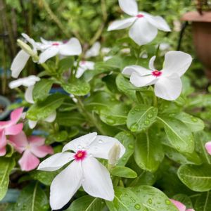 ニチニチソウ 元気です😊 🏷️白い水曜日♡ 🏷️毎日ローズショー 🏷️水曜ローズショー 🏷️花咲く乙女たち♡ 参加させていただきます 雨雲と宿り木 みるみる黒い雲が! 雨が少し降りました☔️ バラの プリンセスドゥモナコ🌹 グラハムトーマス コリンクレイヴン
