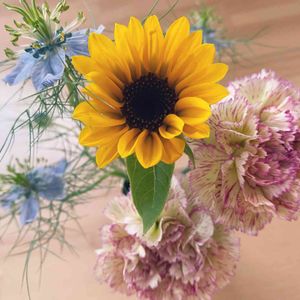 きょうはひまわりにおまけでカーネーション。 部屋の中だと背景が難しい。どこかいいところはないだろうか…。