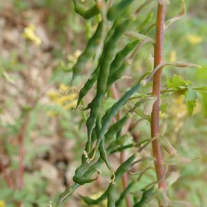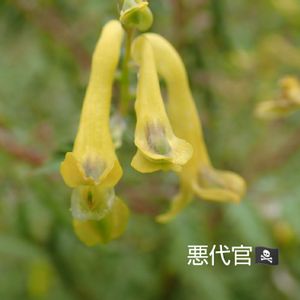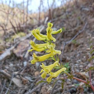 深山黄華鬘(ミヤマキケマン) ケシ科キケマン属の多年草。深山の名はつくが人里に近い野山の林縁や草地に生える。全体に無毛で柔らかく、羽状複葉の葉はさらに細かく羽状に裂ける。花期は4~6月。花は長さ約2㎝の黄色で、後方に長く距(きょ💬花びらや萼の一部が管状に突出したもの)を伸ばす。果実は長さ2~3㎝の朔果。細い線形でやや弓形に曲がり、数珠状にくびれる種子は朔果に1列に並ぶ。種子にはエライオソームがついていて蟻が運ぶ。 黄色のケマンの仲間は多くの種類がある。西日本には母種で全体に小柄な風露華鬘(フウロケマン)が分布する。主に海辺に生える黄華鬘(キケマン)は茎が太く膝ほどまで立ち上がる。 名前の『ミヤマ』という言葉は『キケマン』と区別するためについた。『キ』は花が黄色だから。華鬘(けまん)とは仏像の装飾のひとつで、うちわ形にぶら下がった装飾。 出典『里山の植物 ハンドブック』『野草の名前』