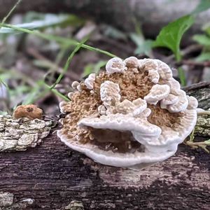 イロハモミジが大きく広がる半日陰花壇の縁木にこんなキノコが生えていました 上の白いキノコは 数日前ペタッと平たかったのが盛り上がって来ました 下はそれと同じ様な白いものも付いていますが 何か人のお面の様にも見えてしまいます 🏷キノコ!…に お願い致します