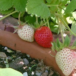 母が育てているイチゴです🍓 同じ株から育ってほぼ同じ大きさの実で隣り合っているのに何故か【紅白】 不思議www