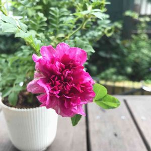 十六夜薔薇 お疲れ様です😵 34度を越える暑さの中、続く乾燥にも負けず咲き始めました。 円形にならないで一部が欠けたような花形から満月十五夜の後の十六夜の名がついたそう。 蕾がイガイガしていて面白い😄