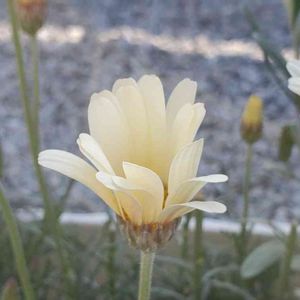 浜松は朝から雨でした☔ 夕方やんだので、少しだけ息子とお庭に出ました。 ローダンセマム レトロクラッカー🌼 この絶妙なクリーム色が好きです😃 開くと退色していってピンクぽくなってしまうけど💦
