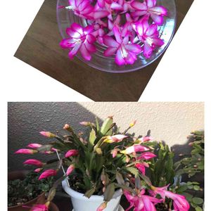 シャコバサボテンが咲き始めました。 去年ばあまり花が咲かなかったけど、今は結構咲いていて嬉しいです😊 今までは、花がしおれてから摘み取ってましたが、今年は、花弁が反ったら摘み取って、炭酸飲料の気が抜けたものを薄めた水に浮かべています。 早く摘み取るとお花がたくさん咲くらしいので、お試ししてます。